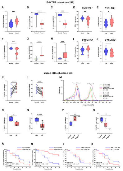 Expression and DNA methylation of CYSLTR1 and CYSLTR2 genes in the E-MTAB in silico and Malmö-CC clinical cohort. Relative expression of CYSLTR1 (A) and M-value distribution of cg00813999 (B) and cg26848126 (C) between normal and tumor samples, CDH1 (D), VIM (E) gene expressions in low- and high-expressed CYSLTR1 groups of patients in E-MTAB cohort. Relative expression of CYSLTR2 (F) and M-value distribution of cg16299590 (G) and cg16886259 (H) between normal and tumor samples, CDH1 (I), VIM (J) gene expressions in low- and high-expressed CYSLTR2 groups of patients in E-MTAB cohort. Relative expression of CYSLTR1 (K) and CYSLTR2 (L) gene expression between normal (N) and primary tumor (PT) samples in the Malmö cohort. (M) Quantitative methylation-specific PCR melting curve analysis in N and PT samples from the Malmö cohort. CYSLTR1 (N) and CYSLTR2 (O) gene expressions in unmethylated and methylated (CYSLTR1 and CYSLTR2) patient groups in the Malmö cohort. CYSLTR1 (P) and CYSLTR2 (Q) gene expression in different stage (stage II, III and IV) tumor samples in the Malmö cohort. Five year overall survival plots for CYSLTR1 (R), CYSLTR2 (S), CYSLTR1—unmethylated and methylated (T) and CYSLTR2—unmethylated and methylated (U) patient samples in the Malmö cohort. HR—hazard ratio, CI—confidence interval, UME—Unmethylated, ME—Methylated, * p < 0.05; ** p < 0.01; *** p < 0.001.