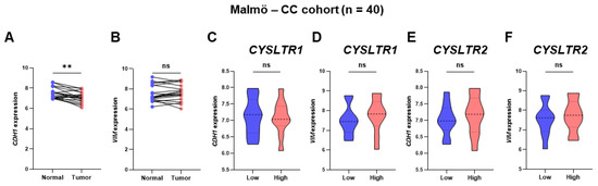 Expression of the EMT markers CDH1 and VIM in patient samples with low and high expression of CYSLTR1 and CYSLTR2 genes in the Malmö–CC clinical cohort. Relative expression of CDH1 (A) and VIM (B) genes between normal and primary tumor samples. CDH1 (C) and VIM (D) gene expressions in low and high CYSLTR1 groups of patients. CDH1 (E) and VIM (F) gene expressions in low and high CYSLTR2 group of patients. ** p < 0.01; ns = non-significant.