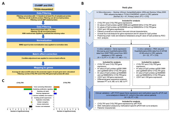 (A) Flowchart for CRC-specific DNA methylation data collection from TCGA-COADREAD dataset. (B) Flowchart for study designing, normal—N, adenoma—AD, primary tumor—PT and distant metastasis—ME. (C) The role of CYSLTR1 and CYSLTR2 in different cancer hallmarks based on different datasets and publications (based on the Cancer Hallmarks Analytics Tool (CHAT); http://chat.lionproject.net, accessed on 8 February 2022).