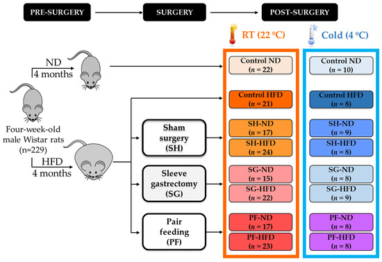 Four-week-old male Wistar rats (n = 229) obtained from the breeding house of the University of Navarra were housed in individual cages and maintained under pathogen-free conditions, controlled temperature (22 ± 2 °C), relative humidity (50 ± 10%) and on a 12:12 light–dark cycle (lights on at 08:00 am). Animals were fed ad libitum for 4 months with either a normal diet (ND) (n = 32) (12.1 kJ: 4% fat, 82% carbohydrate and 14% protein, diet 2014S, Harlan, Teklad Global Diets, Harlan Laboratories Inc., Barcelona, Spain) or a high-fat diet (HFD) (n = 197) (23.0 kJ/g: 59% fat, 27% carbohydrate and 14% protein, diet F3282; Bio-Serv, Frenchtown, NJ, USA) (Figure 1). Body weight and food intake were registered weekly. DIO rats were randomly assigned into 3 weight-matched groups: (i) sleeve gastrectomy (resecting 60% of total gastric volume) (n = 54); (ii) sham surgery without gastric resection (n = 58); and (iii) pair-feeding that received the same amount of food eaten by the gastrectomized group (n = 56). Anesthesia, sham surgery and sleeve gastrectomy were performed according to previously described methodology [23]. Following the surgical interventions, DIO rats were fed either ND or HFD. Moreover, 3 weeks after surgery, a group of rats were exposed to cold (4 °C, n = 68) for 1 week in order to evaluate BAT function, whereas the rest of animals remained at RT (22 °C, n = 161) [5,54]. Four weeks after the surgical and dietary interventions, rats were killed by decapitation after an 8-h fasting period. All experimental procedures conformed to the European Guidelines for the care and use of Laboratory Animals (directive 2010/63/EU) and were approved by the Ethical Committee for Animal Experimentation of the University of Navarra (049/10).