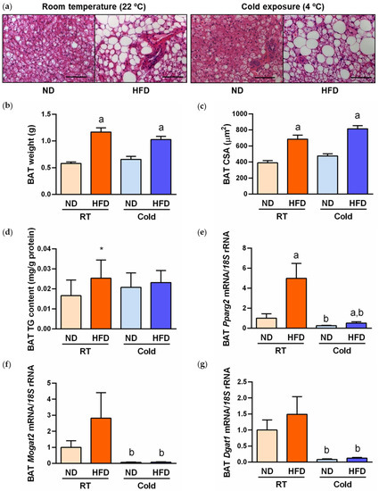 Protective effect of cold exposure against BAT whitening by reducing triacylglycerol content. (a) Representative hematoxylin–eosin-stained images of BAT whitening in rats fed either ND or HFD at RT and 1 week after cold exposure (magnification 200×, scale bar = 100 µm). BAT weight (b), cell surface area (CSA) (c), triacylglycerol content (d) and mRNA expression of the lipogenic transcription factor Pparg2 (e) and the effector lipogenic enzymes Mogat2 (f) and Dgat1 (g). The transcript levels in rats fed ND at RT was assumed to be 1. Statistical differences were evaluated by two-way ANOVA or one-way ANOVA followed by Tukey’s post hoc test in case of interaction between factors. a p < 0.05 effect of diet; b p < 0.05 effect of cold exposure; * p < 0.05 vs. rats fed ND.