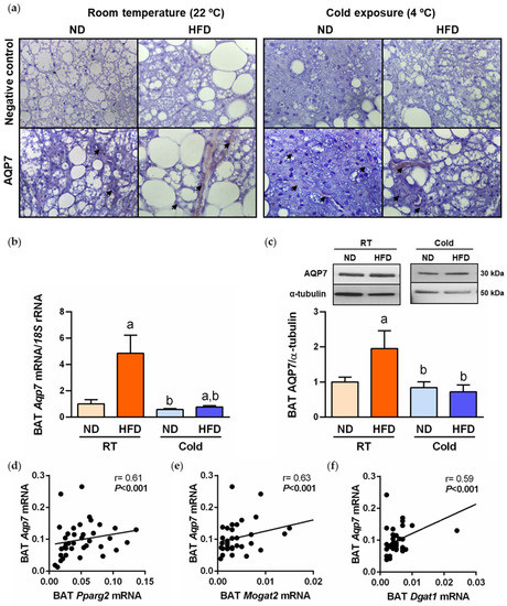 The expression of AQP7 in BAT is increased during BAT whitening and downregulated by cold exposure. (a) Representative images of AQP7 immunostaining in sections of BAT from rats fed either ND or HFD at RT and 1 week after cold exposure (magnification 400×); negative controls without primary antibody are shown in the upper panels and arrows indicate specific staining of AQP7 in the bottom panels. Gene (b) and protein (c) expression levels of AQP7 in BAT of experimental animals. The transcript and protein levels in rats fed ND at RT were assumed to be 1. Correlation of Aqp7 mRNA and lipogenic factors Pparg2 (d), Mogat2 (e) and Dgat1 (f) mRNA levels. Statistical differences were evaluated by two-way ANOVA. a p < 0.05 effect of diet; b p < 0.05 effect of cold exposure.