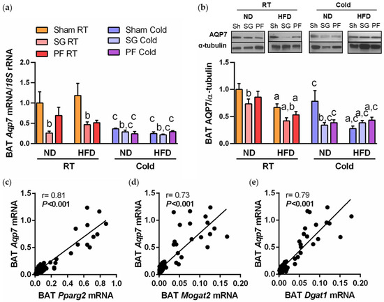 To further confirm the potential association of AQP7 expression with changes in BAT whitening observed after sleeve gastrectomy, we assessed the transcript and protein levels of this glycerol channel in BAT of the experimental groups under both thermic conditions. Significant downregulations of mRNA and protein levels of AQP7 (both p < 0.05) were observed in BAT of DIO rats submitted to sleeve gastrectomy (Figure 5a,b), even in rats exposed to cold, which exhibited lower initial AQP7 transcript and protein levels (both p < 0.05). These changes were not observed in the pair-fed groups, suggesting that the impact of bariatric surgery in AQP7 expression in BAT is beyond caloric restriction. As observed in rats with DIO, post-surgical changes in Aqp7 mRNA were strongly associated with transcripts of Pparg2, Mogat2 and Dgat1 (Figure 5c–e). The switch of DIO rats from HFD to ND also downregulated (p < 0.05) AQP7 protein expression probably as a result of the reduction in BAT whitening in these experimental animals (Figure 5b).