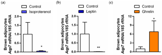 Since our results point to a strong association of AQP7 with the regulation of lipid metabolism in BAT, we assessed the effect of lipolytic (isoproterenol and leptin) and lipogenic (ghrelin) factors on the regulation of AQP7 in rat brown adipocytes. The stimulation of differentiated rat brown adipocytes with isoproterenol (10 µmol/L) or leptin (10 ng/mL) dramatically downregulated (both p < 0.05) Aqp7 expression (Figure 6a,b), while ghrelin (100 pmol/L) upregulated (p < 0.05) the transcript levels of this aquaglyceroporin (Figure 6c).