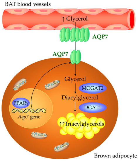 In conclusion, our data provide new insight into the presence and function of AQP7 in brown adipocytes. AQP7 is associated with changes in BAT whitening, based on its strong correlation with factors involved in lipogenesis as well as its regulation by lipogenic (ghrelin) and lipolytic (isoproterenol and leptin) signals. The upregulation of AQP7 in diet-induced obesity might contribute to glycerol influx used for TG synthesis, and hence, brown adipocyte hypertrophy (Figure 7). By contrast, cold exposure and bariatric surgery, which are well-known activators of BAT function, downregulate AQP7 in parallel to the improvement of BAT whitening. Further investigations are required to establish the suitability of the regulation of AQP7 in BAT as a therapeutic target for human obesity-associated type 2 diabetes.