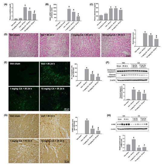 Canrenoic acid (CA) reduces plasma creatinine, tubular cell death, and oxidative stress in renal ischemia-reperfusion (IR) injury. C57BL/6 mice were subjected to 30 min of bilateral renal ischemia. CA (1 or 10 mg/kg) was injected intravenously 30 min prior to ischemia and sacrificed 24 h after reperfusion. Plasma creatinine levels (A), renal mRNA expression of NGAL (B), and plasma aldosterone levels (C). Representative images of H&E staining (D) and TUNEL staining (E) of kidney sections. The apoptotic cells were counted per ×200 field. Western blots showing the bands of cleaved and uncleaved caspase-3 in kidney tissue lysates; relative protein levels were normalized to levels of β-actin (F). Representative images of 4-HNE immunohistochemical staining of kidney sections; the positive cells were counted per ×200 field (G). Western blots showing the bands of 4-HNE in kidney tissue lysates; relative protein levels were normalized to levels of β-actin (H). The values are expressed as the means ± SEM. * p < 0.05 compared to sham group. # p < 0.05 compared to IR group.