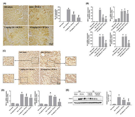 CA reduces neutrophil infiltration, inflammatory cytokines, and HMGB1 release in the kidney of IR mice. Representative images of polymorphonuclear leukocytes (PMN) staining of kidney sections; the positive cells were counted per ×200 field (A). Renal mRNA expression of pro-inflammatory genes, MCP-1, TNFα, IL-6, and MIP-2; relative mRNA levels were normalized to levels of GAPDH (B). Representative images of HMGB1 immunohistochemical staining of kidney sections (C). Renal mRNA expression of profibrotic genes, TGF-β, and α-SMA; relative mRNA levels were normalized to levels of GAPDH (D). Western blots showing the bands of COX-2 in kidney tissue lysates; relative protein levels were normalized to levels of β-actin (E). The values are expressed as the means ± SEM. * p < 0.05 compared to sham group. # p < 0.05 compared to IR group.