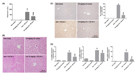 CA reduces hepatocellular damage, neutrophil infiltration, and inflammatory cytokines in the liver of IR mice. Plasma ALT levels (A). Representative images of H&E staining (B) and PMN staining (C) of liver sections; the positive cells were counted per ×200 field. Hepatic mRNA expression of proinflammatory genes, IL-6, IL-1β, and MIP-2; relative mRNA levels were normalized to levels of GAPDH (D). The values are expressed as the means ± SEM. * p < 0.05 compared to sham group. # p < 0.05 compared to IR group.