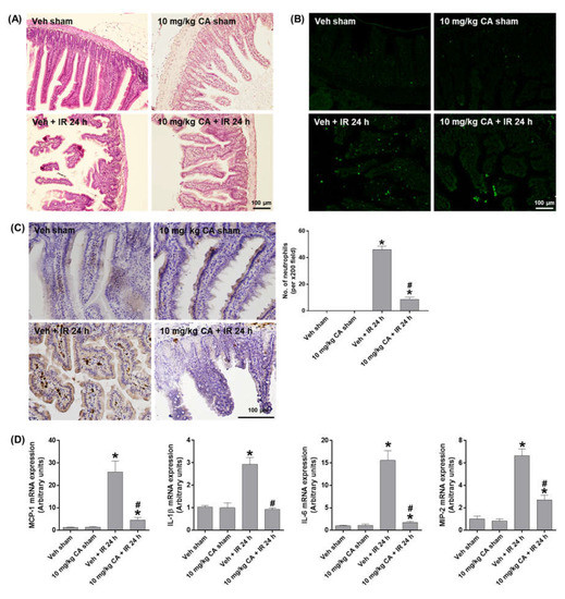 CA reduces small intestinal damage, apoptosis, neutrophil infiltration, and inflammatory cytokines in the small intestine of IR mice. Representative images of H&E staining (A), TUNEL staining (B), and PMN staining (C) of small intestine sections; the number of neutrophils was counted per ×200 field. Intestinal mRNA expression of proinflammatory cytokines, MCP-1, IL-1β, IL-6, and MIP-2; relative mRNA levels were normalized to levels of GAPDH (D). The values are expressed as the means ± SEM. * p < 0.05 compared to sham group. # p < 0.05 compared to IR group.
