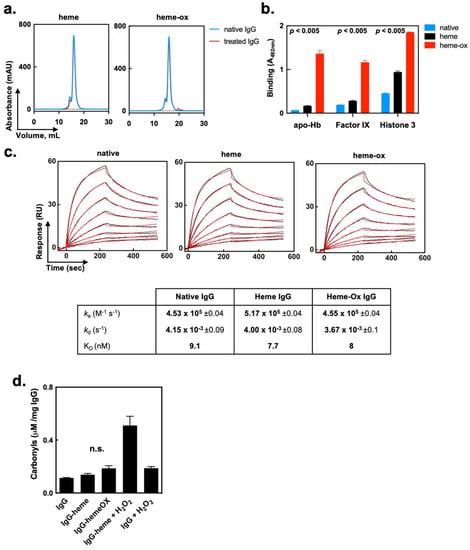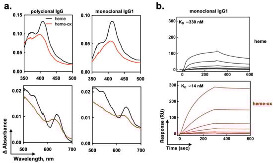 - With regard to the preparation of samples, polyclonal IgG (PBS dialyzed) was first diluted to 10 mg/mL (67 μM) in PBS, and treated with 40 μM of final concentration of heme (Fe3+), heme-ox, or excipient only. After treatment, the preparations were stored at 4 °C until use.