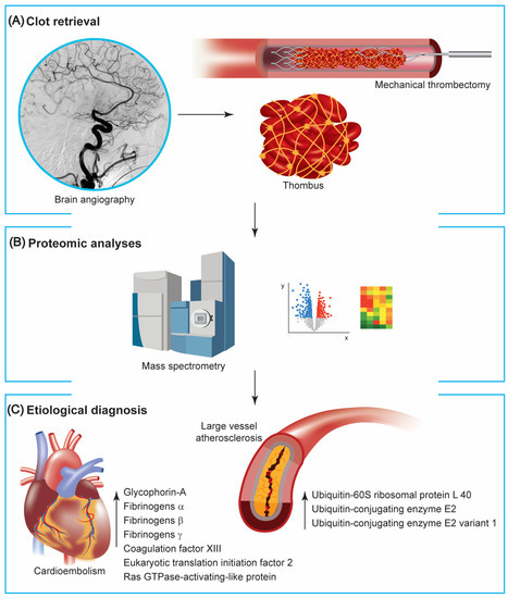 Proteomic studies on clots retrieved from mechanical thrombectomy. (A) Patients with large vessel occlusion can be treated with mechanical thrombectomy, making the retrieved thrombus available for further analysis. (B) Mass spectrometry and pathway analyses of generated data are instrumental to investigate proteins extracted from clots. (C) Available reports using proteomic technologies point out a different composition between clots with cardioembolic and atherosclerotic origins, with the formers containing more proteins associated with red blood cells and the coagulation cascade and the latter with the proteasome-ubiquitin pathway.