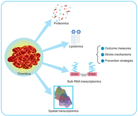 Current application and future perspectives on clot research using multi-omic approaches. Thrombi retrieved from patients with large vessel occlusions can be analyzed using proteomic, metabolomic, and transcriptomic approaches, or combinations of these. Recently, metabolomic studies have focused on specific subtypes of metabolites, i.e., lipids. These are involved in cell membrane dynamics, transport of bioactive macromolecules, and molecular synthesis, holding the potential to increase knowledge on the cellular composition of clots. Regarding transcriptomic analyses, available reports both on human and animal models used bulk RNA, namely the pooled RNA derived from all the cells in a sample. Further interesting approaches would include single-cell RNA and spatial transcriptomics. The former investigates the whole transcripts of each cell in the clot, while the latter provides a spatial map based on barcoded RNAs with high spatial resolution, enabling the investigation of rare cell types and new molecular targets.