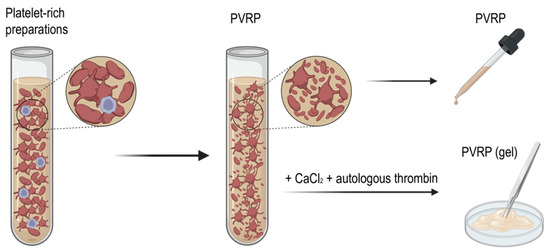 Plasma processing causes an increase in platelet concentration above its baseline level in whole blood [8,12]. Autologous plasma is prepared from the patient’s own blood following procedures that are straightforward and easy to perform: the patient’s peripheral blood is collected into anticoagulant-containing test tubes and fractionated, most commonly, in a two-step centrifugation process. In the first step, blood is centrifuged to separate erythrocytes (the centrifugation pellet) from the rest of the blood. In the second step, plasma that forms the supernatant of the first step is centrifuged again to concentrate platelets in the bottom of the centrifugation tube. The concentrated part that constitutes PVRP is ready to be applied directly to the targeted area, where it undergoes endogenous activation. It can be exogenously activated by the addition of calcium mixtures prior to the application onto tissues yielding a gel-like preparation (PVRP gel) [13]. In this way, the healing substances are delivered to places where blood would otherwise rarely go on its own. With autologous application there is low risk of complications, such as infections or immune rejection [14]. Its counterpart, allogeneic PVRP, is much less extensively studied, most notably due to its immunogenicity, infection risk and the need for time-consuming donor selection. However, it may be useful in patients, who are unfit for large blood quantity harvesting, such as in severe traumatic conditions, acute burns with fluid depletion or thrombocytopenia, sepsis, hematological disorders, infections, in the elderly, in neonates or in patients with relative contraindications (corticosteroids, anemia, malignancies, etc.) [15,16].