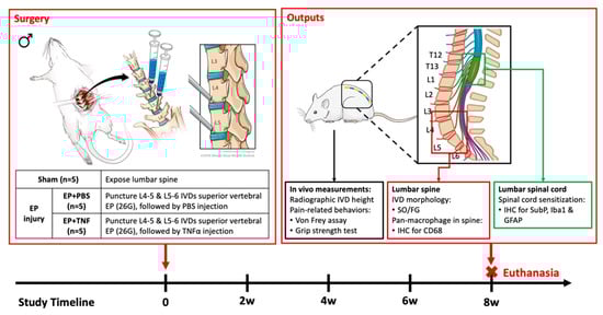 - Lai, A.; Moon, A.; Purmessur, D.; Skovrlj, B.; Laudier, D.M.; Winkelstein, B.A.; Cho, S.K.; Hecht, A.C.; Iatridis, J.C. Annular puncture with tumor necrosis factor-alpha injection enhances painful behavior with disc degeneration in vivo. Spine J. 2016, 16, 420–431. [Google Scholar] [CrossRef]