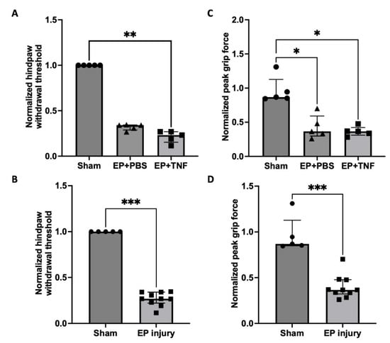 2.2. EP Injuries Induced Sensory Hypersensitivity with Decreased Hindpaw withdrawal threshold and Peak Grip Force
