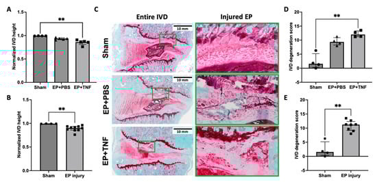 2.3. EP Injuries Induced IVD Degeneration with Increased IVD Height Loss and Degeneration Score