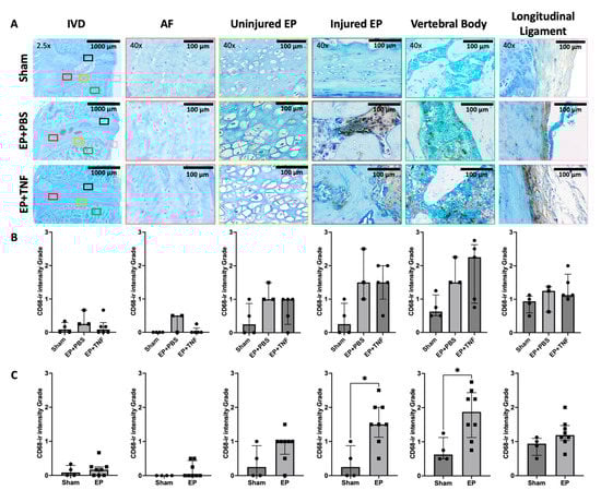 2.5. EP Injury Increased Macrophage Levels in EP and Vertebral Body