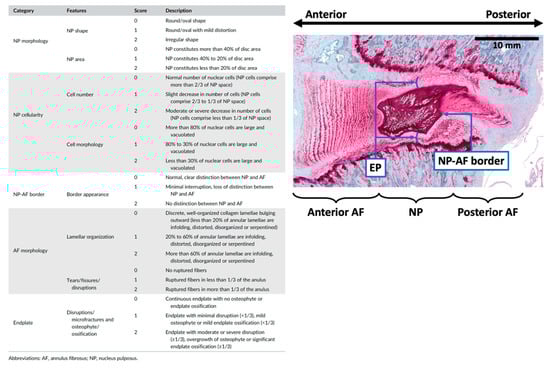 - Lai, A.; Gansau, J.; Gullbrand, S.E.; Crowley, J.; Cunha, C.; Dudli, S.; Engiles, J.B.; Fusellier, M.; Goncalves, R.M.; Nakashima, D.; et al. Development of a standardized histopathology scoring system for intervertebral disc degeneration in rat models: An initiative of the ORS spine section. JOR Spine 2021, 4, e1150. [Google Scholar] [CrossRef]