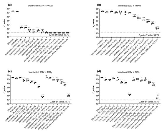 Evaluation of the performance of viability quantitative polymerase chain reaction (qPCR) for detection of inactivated and infectious red sea bream iridovirus (RSIV) using (a,b) propidium monoazide (PMAxx) dye and (c,d) platinum compounds (PtCl4). The black dotted line represents the cut-off cycle threshold (Ct) values for qPCR. The solid line in each interval represents the average Ct value. Asterisks indicate significant differences from infectious RSIV without added viability markers for each viability marker concentration. * p < 0.05; ** p < 0.01; *** p < 0.001; **** p < 0.0001.