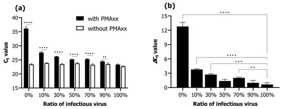 Viability qPCR was assessed according to the proportions of infectious and inactivated RSIV suspensions (infectious RSIV virus ratio; 0%, 10%, 30%, 50%, 70%, 90%, and 100%). Under conditions without the addition of PMAxx, the Ct values negligibly changed from 22.68 ± 0.24 Ct to 23.38 ± 0.24 Ct as the percentage of infectious virus decreased from 100% to 0% (Figure 2a). In contrast, under conditions where PMAxx was added, the Ct values increased notably from 23.32 ± 0.24 Ct to 36.17 ± 0.63 Ct as the percentage of infectious virus decreased from 100% to 0% (Figure 2a). Moreover, the Ct values in the presence of PMAxx were significantly different in all ratios of infectious RSIV (0–90%) except for that at 100% (p < 0.01; p < 0.0001; Figure 2a). In the 0% infectious RSIV ratio interval, the delta Ct value according to the presence or absence of PMAxx was 12.79 (Figure 2b). These results indicate that the PMAxx-based viability qPCR assay is suitable for selectively quantifying infectious RSIV.