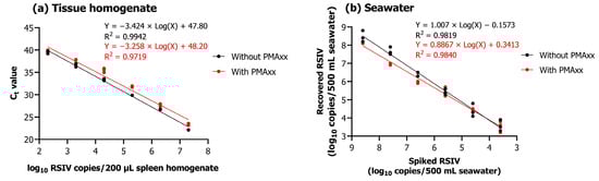 Upon performing qPCR and PMAxx-based viability qPCR of 200 μL tissue homogenates of different concentrations (102.3–107.3 RSIV copies/200 µL), a linear relationship was observed between the Ct value and the concentration of 10-fold serially diluted RSIV (R2; without PMAxx, 0.9942; with PMAxx, 0.9719) (Figure 3a). Different concentrations of RSIV (101.6–108.6 RSIV copies/500 mL) were spiked into seawater and concentrated based on iron flocculation, followed by qPCR and PMAxx-based viability qPCR. As a result, a strong linear relationship was observed between spiked RSIV and the number of recovered RSIV copies (R2; without PMAxx, 0.9819; with PMAxx, 0.9840) (Figure 3b).
