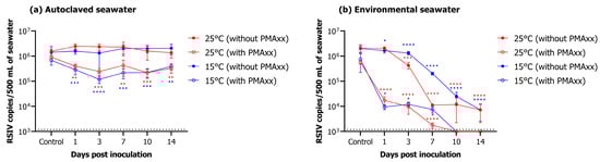 Changes in RSIV copy number under different marine environments. (a) Results of changes in RSIV viability in autoclaved seawater over time. (b) Results of changes in RSIV viability in environmental seawater over time. Error bars represent the standard deviation of the mean (n = 3). The dotted line represents the detection limit. Asterisks indicate significant differences (* p < 0.05, ** p < 0.01, *** p < 0.001, **** p < 0.0001) compared with the control.