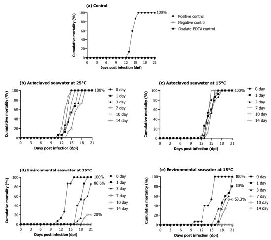Cumulative mortality of rock bream after intraperitoneal injection of the resuspended virus after storing RSIV for different days in various seawater environments. (a) Positive control, 106.2 RSIV copies/fish (cell culture); negative control, PBS; oxalate-EDTA control and oxalate-EDTA buffer 10-fold dilution were injected. (b,c) Injection of RSIV stored in autoclaved seawater at 25 °C and 15 °C. (d,e) Injection of RSIV stored in environmental seawater at 25 °C and 15 °C.