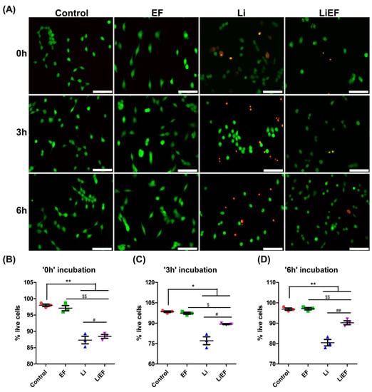 Viability analysis of 661W cells in response to EF stimulation and irradiation. (A) Fluorescent images of 661W cells stained with Calcein AM and ethidium homodimer 1 (EthD-1) dyes to quantify live (green) and dead (red) cells respectively at 0 h, 3 h and 6 h time points in: Control, EF, Li, and LiEF. (Scale bar = 100 µm). (B–D) The graphs represent quantitatively analyzed percent of live cells at 0 h (B), 3 h (C), and 6 h (D) post treatment in Control, EF, Li, and LiEF using ImageJ software (Open source software; National Institutes of Health, Bethesda, MD, USA). (number of cells in triplicates = 150 cells; 3 independent experiments; mean ± S.E.M.; ** p < 0.01,* p < 0.05 w.r.t Control; $$ p < 0.01, $ p < 0.05 w.r.t EF; ## p < 0.01, # p < 0.05 w.r.t Li; One way-ANOVA followed by Bonferroni’s test).