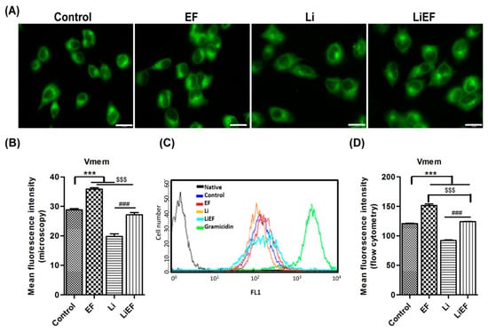 Studies showed that cell survival, proliferation, and migration are related to the plasma membrane potential (Vm) []. We analyzed the Vm of cells using anionic fluorescent dye DiBAC4 (3) by fluorescence microscopy and flow cytometry at 0 h time point (Figure 2). In control cells, we observed the random accumulation of dye. In contrast, we noticed a relatively hyperpolarized state of the cell membrane on the leading edge, compared to depolarized rear end in EF stimulated cells. However, Li exposure hyperpolarized the plasma membrane (Figure 2A,C). The fluorescence intensity profile of membrane potential measured at flow cytometry revealed 24% decrease in Li cells and 25% increase in EF cells compared to control cells (Figure 2B). Moreover, 35% increase in intensity was observed in LiEF cells compared to Li cells (Figure 2C,D).