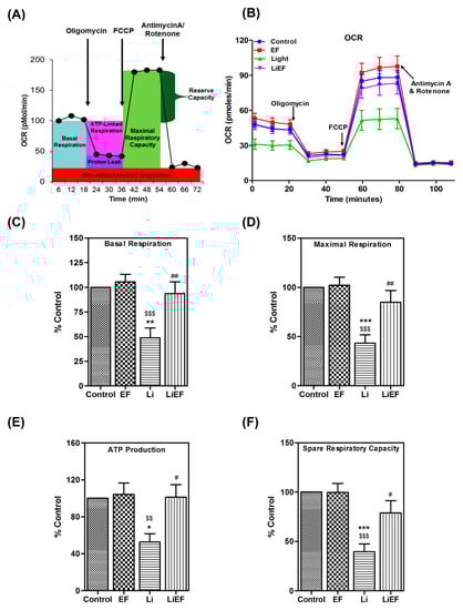 Representative OCR (Oxygen Consumption Rate) bioenergetics profile in 661W cells. (A) General schematic representation of OCR bioenergetics profile in relation to time following addition of oligomycin (complex V inhibitor), the uncoupler FCCP (protonophore) and the electron transport inhibitor antimycin/rotenone (inhibitors of complex III/I). (B) OCR graph reflects the mitochondrial respiration in 661W cells. The bar graphs represent calculated (C) Basal respiration, (D) Maximal respiration, (E) ATP production, and (F) Spare respiratory capacity. (mean ± S.E.M.) (N = 6–10 replicates, 3 independent experiments. Significance was accepted at *** p < 0.001, ** p < 0.01,* p < 0.05 w.r.t Control; $$$ p < 0.001, $$ p < 0.01, w.r.t EF; ## p < 0.01, # p < 0.05 w.r.t Li; One way-ANOVA followed by Bonferroni’s test).