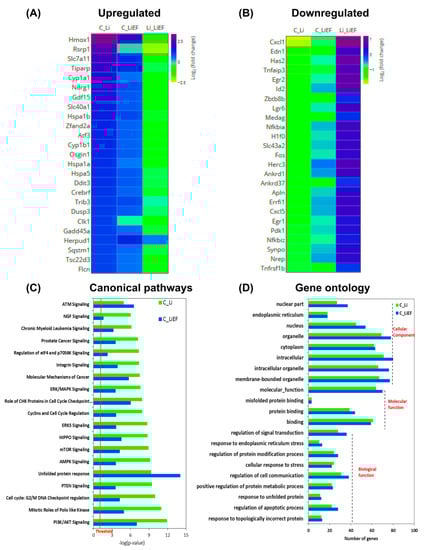Our RNA-sequencing analysis revealed a total of 5067 and 2958 genes differentially regulated in Li and LiEF cells with respect to control. We included the heat map of top 25 upregulated and downregulated genes from Li and LiEF with respective to control cells (Figure 5A,B). Ingenuity pathway analysis showed 19 significantly affected pathways with an upregulated unfolded protein response (UPR) and Ataxia-telangiectasia mutated (ATM) signaling pathways in LiEF cells suggesting a role of EF stimulation to abrogate Li-induced stress. (Figure 5C). Gene Ontology analysis revealed significantly enhanced processes in Li and LiEF cells (Figure 5D). To determine the UPR upregulation in Li and LiEF, we examined three distinct branches of UPR: ATF6, PERK and IRE1α using qRT-PCR and Western blotting (Figure 6A–C). These branches of UPR operate in parallel to regulate the expression of numerous genes in order to maintain cellular homeostasis or induce apoptosis if ER stress cannot be alleviated []. Figure 6D shows differentially expressed genes involved in the UPR pathway in Li and LiEF cells as obtained from RNA sequencing data.