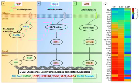 Unfolded protein response (UPR) pathway. (A–C) Schematic representation of UPR pathway. The UPR pathway is mediated by three different branches: (A) PERK-eIF2α-ATF4-CHOP branch, (B) IRE1-XBP1 branch, and (C) ATF6 branch. These three branches are indicated by different colored font. Markers investigated in this study are highlighted in red (RNA), blue (protein) and green (both RNA and protein). (D) Heat map of Differentially Expressed Genes (DEGs) involved in UPR pathway based on log2(fold change) obtained from RNA-Sequencing. Heat map is generated using a graphical user interface Plotly.