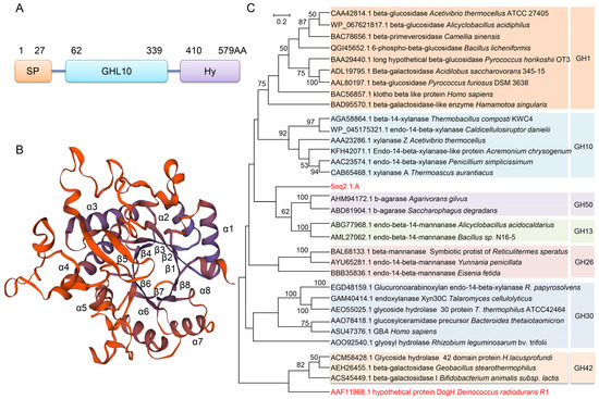 The Uniprot database predicted that DogH was composed of 579 amino acids, including a signal peptide consisting of 27 amino acid residues, a glycosidic hydrolase GHL10 family domain (62–339 residues) and a hydrophilic terminal sequence (529–579 residues) (Figure 1A). A DELTA-BLAST search of the NCBI database showed that DogH had the highest sequence similarity (23.9% similarity, 68% coverage) to the GH10 structural domain of Trichocoleus sp. FACHB-591. Swiss-Model predicted the structure of DogH and showed that it had 21% sequence similarity to the Cwp19 protein from Clostridium difficile [17]. The Cwp19 protein contained the GHL10 domain, and we used the Cwp19 crystal structure as a template (SMTL ID: 5oq2.1.A) to simulate the folding structure of the DogH protein. DogH contains a typical glycoside hydrolase GH10 family (β/α)8-barrel structure, also known as the TIM barrel structure (Figure 1B). It is essentially consistent with the secondary structure predicted by PSIPRED online (Figure S1 in the Supplementary Materials).