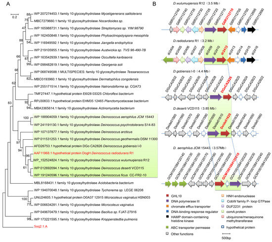 Phylogenetic analysis of DogH proteins and physical organization comparative analysis of gene clusters compared with other Deinococcus. (A) Neighbor joining tree method was used to compute the distances of DogH proteins using the MEGA 7.0 program. The D. radiodurans DogH protein and the 5oq2.1.A protein from uncultured bacteria are indicated with red font. (B) The gene organization of dogH homologous sequences in different Deinococcus species. D. wulumuqiensis R12; D. radiodurans R1; D. gobiensis I-0; D.deserti VCD115; D. aerophilus JCM15443. Same colors indicate similar predicted functions of the depicted ORF. Orthologous genes of dogH are shown in red. Orthologous genes of dr2410 and dr2413 are shown in purple and orange, respectively. Adjacent genes are labeled with other colors. The genome size is indicated at the end of the physical organization.