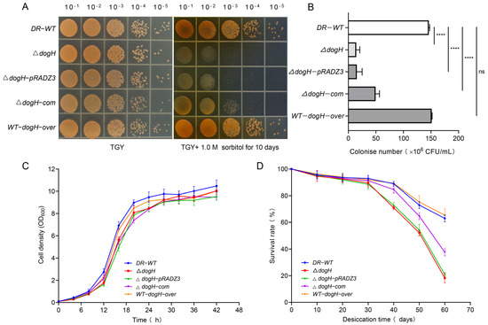 The deletion of the dogH gene reduced sorbitol and desiccation stress tolerance of D. radiodurans. (A) Sorbitol sensitivity assays of different D. radiodurans strains. Spotted agar plates after sorbitol treatment and serial dilution. (Left) 0 M sorbitol; (right) 1.0 M sorbitol for 10 days. (B) Statistics of colony number of different D. radiodurans strains under 1.0 M sorbitol stress for 10 days. (C) The growth curves of different D. radiodurans strains in TGY. (D) Survival curves of different D. radiodurans strains following exposure to desiccation. The survival rate was expressed as the percentage of the number of colonies in the treated samples compared with those in untreated controls. DR-WT: wild-type strain; ΔdogH; dogH-deleted mutant; ΔdogH-pRADZ3: dogH mutant transformed with pRADZ3 empty plasmid; ΔdogH-com; dogH mutant supplemented with the dogH gene; WT-dogH-over: wild-type overexpression with the dogH gene. One-way ANOVA and Dunnett’s multiple-comparison test; A probability value of p ≤ 0.05 was considered significant. Data are presented as averages ± SEM. ****: p ≤ 0.0001; and ns: non-significant.