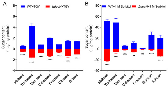 GC-MS quantitative analysis of carbohydrate metabolites in D. radiodurans. (A) Without sorbitol treatment; (B) with 1.0 M sorbitol stress treatment for 3 h. WT: wild-type strain; ΔdogH: dogH-deleted mutant. One-way ANOVA and Dunnett’s multiple-comparison test; A probability value of p ≤ 0.05 was considered significant. Data are presented as averages ± SEM. ****: p ≤ 0.0001; **: p ≤ 0.01; and ns: non-significant.