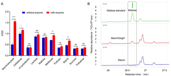 Substrate specificity and product analysis of DogH glycoside hydrolase. (A) Detection of carbohydrate breakdown. A significant difference was observed in starch/amylase control; some differences in DogH in the carbohydrate test were significant, such as cellobiose, melibiose and starch. (B) Quantitative determination of decomposition products of DogH glycoside hydrolase by HPLC-MS. Green peak; maltose standard; red peak: addition of DogH glucoside hydrolase to starch to produce maltose products; blue peak: no DogH glycoside hydrolase is added to starch, so maltose is not produced. One-way ANOVA and Dunnett’s multiple-comparison test; A probability value of p ≤ 0.05 was considered significant. Data are presented as averages ± SEM. ****: p ≤ 0.0001; **: p ≤ 0.01; *: p ≤ 0.05; and ns: non-significant.