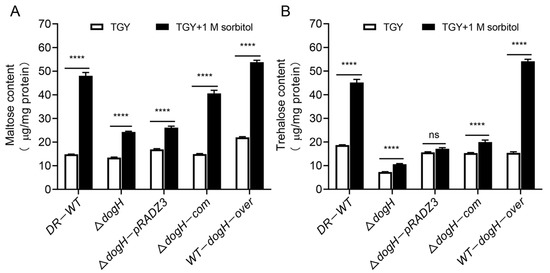 Under 1.0 M sorbitol stress for 3 h, maltose and trehalose content were significantly increased compared to normal growth conditions, and the results were consistent with those shown in Figure 4A,B. Compared with the ΔdogH mutant, the content of maltose in the ΔdogH-com complementary strain increased from 24.2 μg mg protein−1 to 40.6 μg mg protein−1, an increase of approximately 1.7 times, and the increase in trehalose, from 10.6 μg mg protein−1 to 20 μg mg protein−1 amounted to two times. The results indicated that the dogH gene could affect the content of maltose and trehalose.