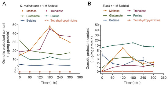As a Gram-positive bacterium, D. radiodurans can survive under extreme conditions of drought, radiation and nutrient deprivation. E. coli, as a Gram-negative bacterium, can tolerate different osmotic pressures in the anaerobic gastrointestinal tracts of mammals. In order to avoid the adverse damage caused by hypertonic stress, cells accumulate osmoprotectants in the cytoplasm through synthesis or ingestion. In this study, HPLC-MS was used for the quantitative analysis of the accumulation of various osmoprotectants in D. radiodurans and E. coli strains after 300 min of treatment with 1.0 M sorbitol stress (Figure 7).