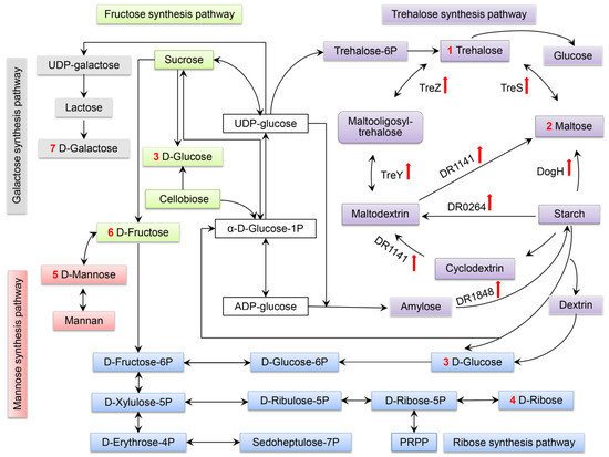 Redundancy is a distinctive feature of D. radiodurans [10]. It contains two amylases, DR1472 (function unknown, presumably containing α-amylase catalytic structural domain) and DR1141. In the starch hydrolysis pathway, gene dr1141 is predicted to encode cyclomaltodextrinase/maltogenic alpha-amylase/neopullulanase, which may degrade starch into maltodextrin or maltose in response to sorbitol stress. The expression level increased by 3.9 times, as shown in Figure 8. DogH belongs to the GH-A clan and uses a retention mechanism to act at the catalytic site containing two glutamate residues [27]. DR1141 belongs to family 13 of the GH-H clan and the catalytic nucleophilic base is aspartate. Whether DR1141 and DogH have synergistic effects in the starch metabolic pathway will be investigated in our next work.