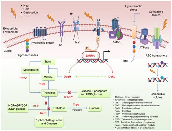 Osmotic stress, caused by abiotic stresses such as desiccation, salt stress, high temperatures and freezing, is one of the main stresses suffered by microorganisms. In order to adapt to environmental stress, microorganisms have evolved a series of mechanisms that aid in sensing, responding to, resisting and regulating abiotic stress, namely osmotic regulation mechanisms [42]. Understanding how bacteria living in extreme environments adjust their metabolic activity and increase the resistance of microorganisms to stress is important for the optimization of biological processes [43]. The exposure of cells to desiccation, high-concentration solutes and other environments can easily lead to cell dehydration, which is eventually manifested as osmotic stress. Osmotic stress results in slow microbial growth by inhibiting genes related to metabolism, cell wall biogenesis, DNA and protein synthesis [44]. Dehydration-tolerant organisms have different means of protecting their cellular macromolecules from the harmful effects of water deprivation. In Figure 9, the regulatory mechanism of D. radiodurans’ tolerance to osmotic stress is summarized. From potassium accumulation to protein regulation, these mechanisms play a synergistic role in cellular osmosis regulation.
