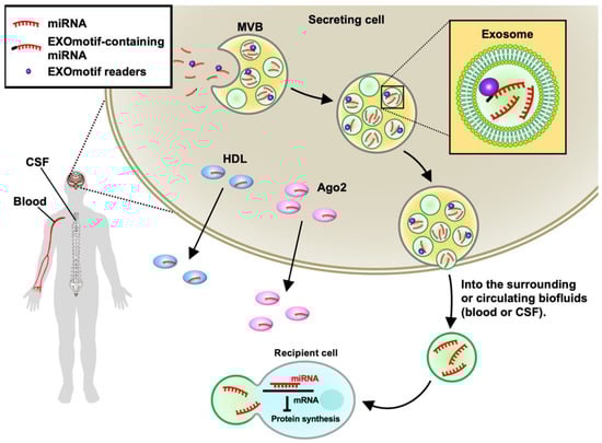 MicroRNA (miRNA) sorting. After miRNA biogenesis, mature miRNAs bound by Argonaute 2 (Ago2) or high-density lipoprotein (HDL) can be transported extracellularly. Some miRNAs can be secreted by the means of exosomes, which are formed within multivesicular bodies (MVBs) in the cytoplasm. EXOmotif readers, such as hnRNPA2B1 and FUS, bind to specific sequences (EXOmotif) existing in miRNAs and facilitate the loading of EXOmotif-containing miRNAs into exosomes. When MVBs fuse with the plasma membrane, exosomes are released into the extracellular space surrounding the secreting cell and eventually enter the circulating biofluids, such as the blood and cerebrospinal fluid (CSF). The recipient cell uptakes these miRNA-containing exosomes, resulting in the alteration of their gene expression profile. The extracellular miRNAs, including miRNAs bound by proteins or encapsulated in exosomes, in the blood, and CSF can be detected as biomarkers for neurodegenerative diseases (NDs).