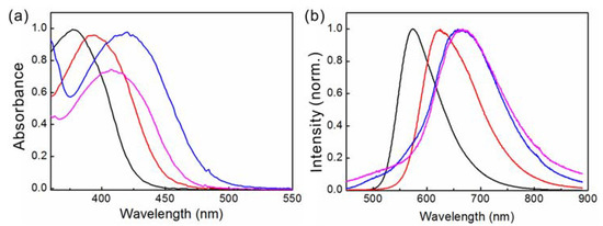 Steady-state (a) absorption and (b) fluorescence spectra of 1 (black), 2 (red), 3 (blue), and 4 (magenta) in chloroform.