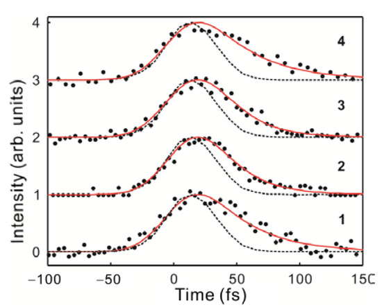 TF signals that were detected at the enol emission wavelengths. The red lines represent single exponential fits, and the dashed lines represent the cross-correlation between the pump and gate pulses.