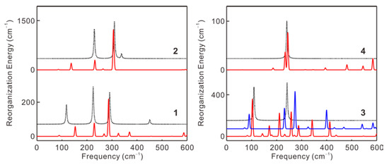 In addition to the decay, large amplitude oscillations of the TF signals arising from the NWP motions in the excited state are apparent. As the ESIPT rates are fast enough to excite the reaction products impulsively, the oscillations have structural and dynamical information of the excited product state. A Fourier transform of the residual that was obtained from the three-exponential fit gives the coherent vibrational spectrum (CVS) that was attained via TF (CVSF), shown in Figure 3b. The CVSFs show vibrational peaks of frequencies below 600 cm−1 because of the finite time resolution of the TF apparatus. An oscillation of frequency ω is attenuated by a factor of exp(−σ2ω2/2), where σ is the standard deviation of the instrument response function (IRF) assuming a Gaussian function. Therefore, a 500 cm−1 mode would be attenuated by a factor of 3.6 due to the finite 40 fs time resolution of this work. We also exploited the linear prediction singular value decomposition (LPSVD) method to retrieve the CVSFs [25,26], and the major peaks that were acquired by LPSVD are listed in Table 2. The LPSVD method is appropriate for low signal-to-noise ratio data and a complex time trace that consists of multiple exponential and damped sinusoidal functions [27]. Within the Condon approximation, the amplitude of an NWP is proportional to the vibrational reorganization energy [28], which can be attained theoretically from quantum chemical calculations. Although the Fourier transform gives an unbiased CVSF, it is not straightforward to retrieve amplitudes of oscillations at time zero because the amplitude depends on the height and width of the peaks, whereas LPSVD analysis gives the amplitudes directly. For example, the 291 cm−1 peak of 1 looks small in the Fourier power spectrum, but it is one of the major peaks in the CVSF by LPSVD. Moreover, subtraction of the exponential components by nonlinear least square fits may introduce artifacts and uncertainty.