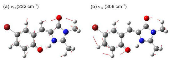 The dynamics of the GFP chromophore in a protein matrix and solution have been studied extensively. The GFP chromophore is located in the central α-helix and the 11-stranded β-barrel [3], and the microscopic environment of the GFP chromophore strongly influences its photophysical properties. The chromophore shows low fluorescence quantum yield in solution compared with that in an intact protein environment [5,6,7,8]. Temperature dependence of the steady-state fluorescence spectrum of the chromophore in solution is different from that in a protein environment, showing less vibronic structure in solution at higher temperatures [9]. Analysis of internal conversion rates revealed a correlation to the conformational variance of p-HBDI, indicating more degrees of freedom in the nuclear coordinates of p-HBDI in solution [10,11,12]. These works assumed that the internal conversion is induced by a volume-conserving motion that is similar to the isomerization with a “hula twist” [13].
