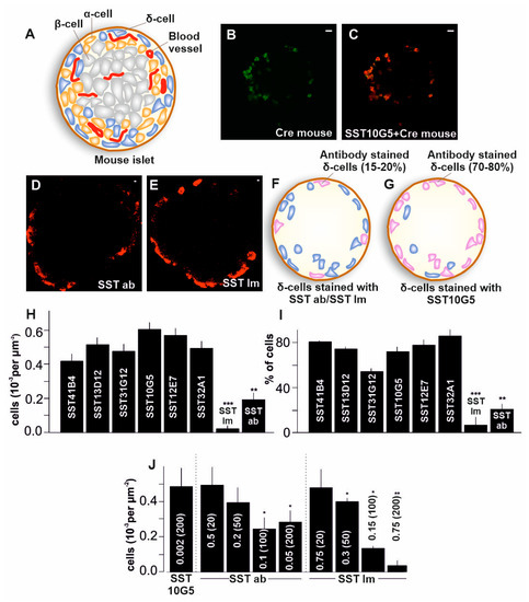 Co-localization of immune-stained δ-cells with transgenic islets—(A) Cartoon depiction of a mouse islet showing the α, β and δ-cells, (B) View of islet from SST-iCre mice with δ-cells represented in green (Scale bar = 10 µm), (C) Islets from SST-iCre mice labelled with δ-cell specific antibody SST10G5 (Scale bar = 10 µm), (D) Islets from SST-iCre mice labelled with SST-14 specific commercial antibody from Abcam (SST ab) (Scale bar = 1 µm), (E) Islets from SST-iCre mice labelled with SST-14/28 specific commercial antibody from Immunostar (SST Im) (Scale bar = 1 µm), (F) Cartoon depiction of δ-cells stained with commercial antibodies (SST ab/SST Im), (G) Cartoon depiction of δ-cells stained with newly developed antibodies (SST10G5), (H) Total number of δ-cells stained with SST antibodies in transgenic mice with eYFP label expressed on SST-Cre promotor. Each experiment was repeated on 5–10 islets on two different days using 3–6 mice, (I) Co-localization of antibody labelled cells with eYFP expressing cells specific for SST-Cre promotor. Each experiment was repeated on 6–8 islets on two different days using 5–8 mice, (J) Number of SST-cells stained with different dilutions of SST antibodies. Total number of antibody stained δ-cells with different dilutions of antibodies specified in the figure (20, 50, 100 and 200 are dilutions of 1:20, 1:50, 1:100 and 1:200 respectively). Each experiment was repeated on 8–10 islets on two different days using 3–5 mice. (* p < 0.05, ** p < 0.01, *** p < 0.001).