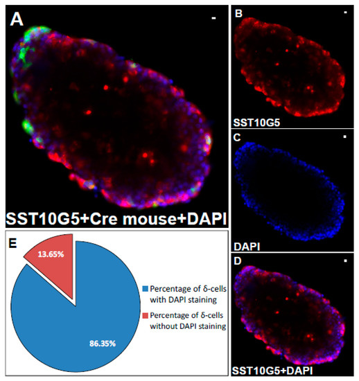 Immunostained δ-cells counterstained with nuclear stain DAPI—(A) Islets from SST-iCre mice labelled with δ-cell specific antibody SST10G5 counterstained with nuclear stain DAPI (Scale bar = 10 µm), (B) Immunostained islets in (A) showing the SST10G5 δ-cell labelling (Scale bar = 10 µm), (C) Immunostained islets in (A) showing the DAPI staining (Scale bar = 10 µm), (D) Immunostained islets in (A) showing the merged image with SST10G5 and DAPI (Scale bar = 10 µm), (E) Pie chart showing the quantification of the SST10G5 δ-cells labelled cells conterstained with DAPI nuclear stain. (The SST10G5 antibody is in red, DAPI is in blue, transgenically labelled δ-cells in green.).