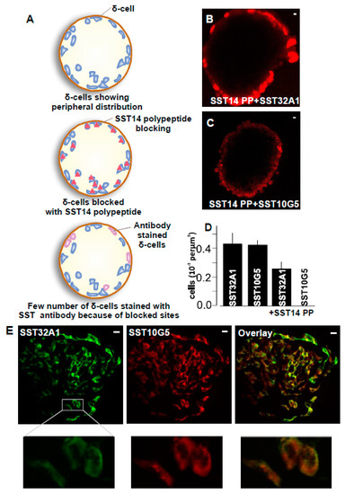 Both SST-14 and SST-28 co-express in mouse islets—(A) Cartoon representation for blocking of islets with SST14 polypeptide (SST14 PP), (B) Images for islets pre-incubated with SST14 PP prior to staining with SST32A1 antibody (Scale bar = 1 µm), (C) Images for islets pre-incubated with SST14 PP prior to staining with SST10G5 antibody (Scale bar = 1 µm), (In (B,C), the SST10G5 and SST32A1 immunostaining are in red.) (D) Number of cells per islet from the experiments as displayed in (A,B) in comparison with controls where islets were stained with SST10G5 or SST32A1 without pre-incubation with SST14 polypeptide. Each experiment was repeated on at least 7 islets on two different days using 3–5 mice, (E) Islets from mice labelled with SST10G5 that mostly detects SST14 and SST32A1 which mostly detects SST28 and overlays. Zoomed images of single δ-cells from each of the conditions specified on the left side of the image (Scale bar = 10 µm). (SST32A1 immunostaining is in green, SST10G5 is in red).
