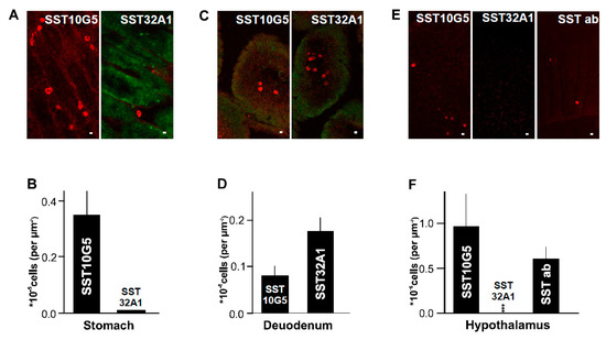 SST-14 expression in the hypothalamus and gut tissues—(A) Images showing a cryo-section of mouse stomach stained with SST10G5 or SST32A1 (Scale bar = 1 µm), (B) Number of cells in image (A) labelled with SST10G5 or SST32A1 in the stomach tissues. Each experiment was repeated on two different days using 3–4 mice. At least 6 sections were analysed in each case, (C) Image showing a cryo-section of mouse duodenum stained with SST10G5 or SST32A1 (Scale bar = 1 µm), (D) Number of cells in image (C) labelled with SST32A1 or SST10G5 in the duodenal tissues. Each experiment was repeated on two different days using 3–4 mice. At least 6 sections were analysed in each case, (E) Image showing a cryo-section of mouse hypothalamus stained with SST10G5 or SST32A1 or commercialy available SST14 antibody (SST ab) (Scale bar = 1 µm), (F) Number of cells in image (E) labelled with SST10G5, SST32A1 or commercially available SST14 antibody (SST ab) in the hypothalamus. Each experiment was repeated on two different days using 5–6 mice. At least 5 sections were analysed in each case. (*** p < 0.001).